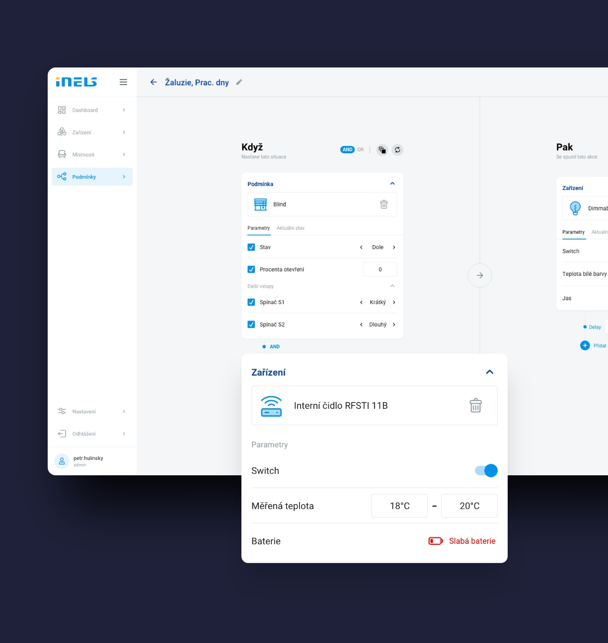 Do nové aplikace jsme vyvinuli i zcela novou funkci podmínkování, která dokáže propojovat stavy a akce jednotlivých zařízení napříč celou aplikací. Tato funkcionalita v původní aplikaci vůbec nebyla a bylo ji tak nutné navrhnout zcela od začátku. Na nastavení podmínek celá aplikace stojí. Jednotlivá zařízení spolu interagují a na základě různých stavů provádějí dané úkony.